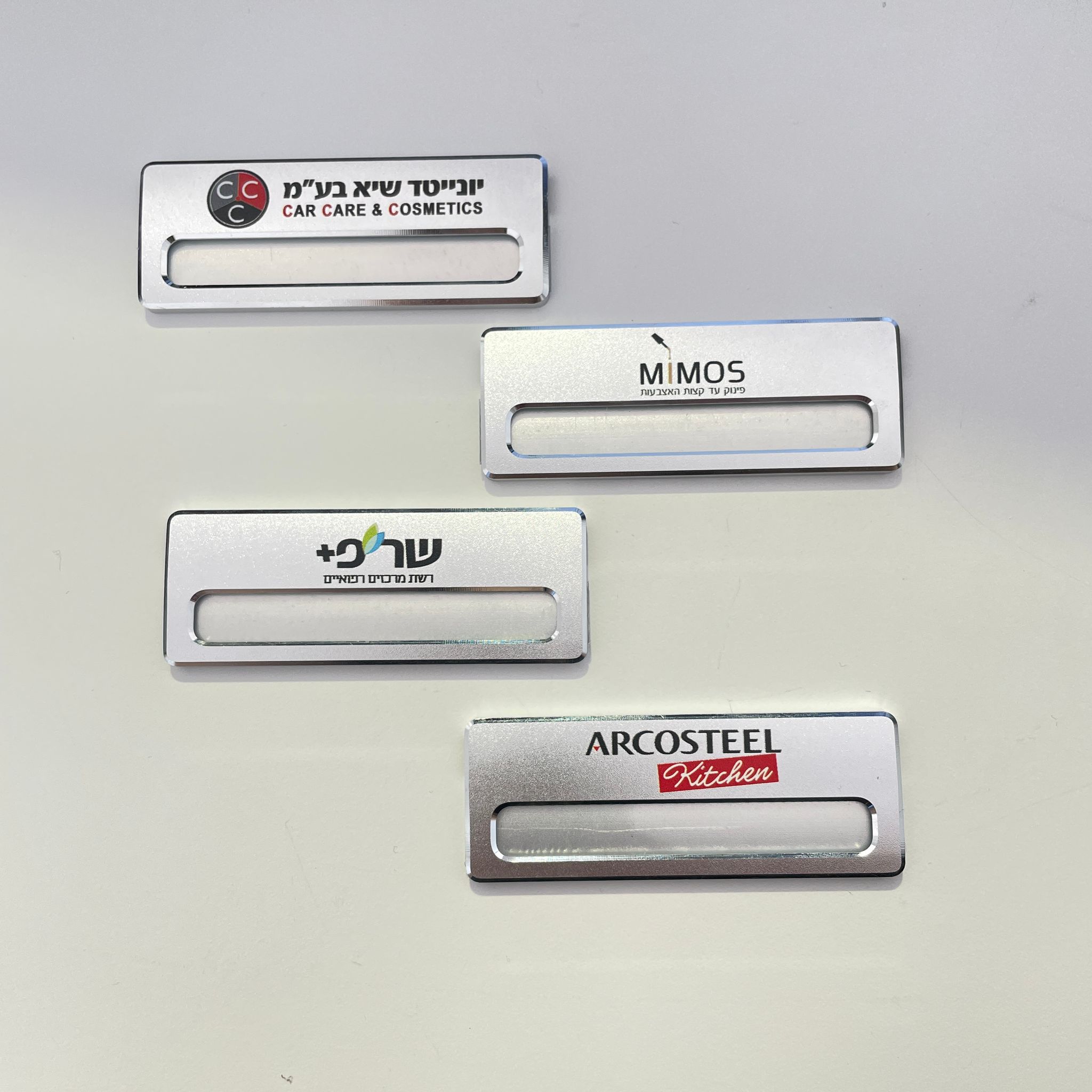תג מתכתי יוקרתי מגיע עם אביזר הצמדה מאחור